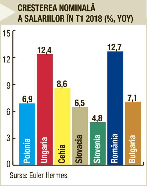 Un studiu realizat de Euler Hermes arată că în multe ţări europene majorarea nominală a salariilor a depăşit cu mult nivelul de creştere a productivităţii. Companiile au absorbit costurile salariale mai ridicate acceptând marje de profit mai scăzute, preferând menţinerea preţurilor la produsele comercializate la niveluri apropiate de cele de până acum, limitând astfel impactul asupra inflaţiei. O excepţie de la acest trend se observă însă în România. „În luna mai a acestui an, în România, inflaţia a înregistrat o valoare de 5,4%. Acest procent a fost influenţat de creşterea nominală a salariilor din primul trimestru, cu 12,7 %. (…) Ungaria şi Slovacia au înregistrat, şi ele, creşteri ale ratei inflaţiei de 2,8 % , respectiv 2,6 %”, arată analiştii departamentului de Cercetare Economică de la Euler Hermes. Aceştia menţionează şi că „în ceea ce priveşte nevoia de finanţare externă brută, în România aceasta se situează la 134 % din rezervele valutare. Ungaria are un excedent de cont curent şi un deficit fiscal acceptabil, iar nevoile sale de finanţare externă sunt adecvate, reprezentând doar 75% în rezervele valutare. Polonia afişează o nevoie de finanţare externă în raport cu rezervele sale valutare de 136% bazate, în general, pe o macroeconomie relativ solidă”.