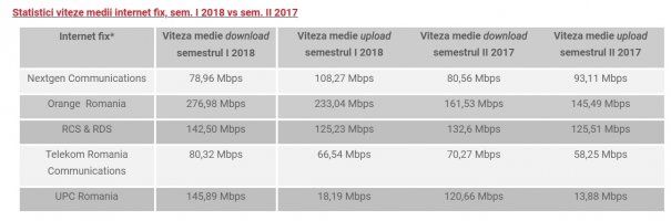 Conform testelor efectuate pe www.netograf.ro, în semestrul I 2018 utilizatorii români au experimentat viteze de download date internet fix în creştere cu aproximativ 14% la nivel naţional şi viteze de download date internet mobil mai mari cu aproximativ 16%, faţa de semestrul II 2017. Astfel, viteza medie de download date internet fix pentru primii 5 furnizori de internet fix în funcţie de numărul de conexiuni a fost de 134,03 Mbps şi de 24,11 Mbps pentru download date internet mobil. In rândul celor mai mari furnizori de internet fix, viteza medie de download pentru testele efectuate pe fir a fost de 221,90 Mbps, iar pe wireless de 68,55 Mbps. Totodată, viteza medie de upload pentru testele efectuate pe fir a fost de 148,87 Mbps, iar pe wireless de 57,35 Mbps.