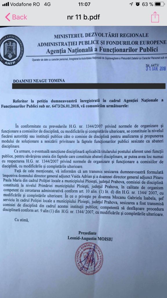 - Florea Daniel si Tomina Neagu (o alta politista locala hartuita de Adrian Vaida si introdusa in Comisia de Disciplina pe acelasi scenariu regizat prost de hartuitor) au facut mai multe plangeri penale impotriva lui Adrian Vaida pentru faptele si ilegalitatile comise in calitatea sa de mare manager.