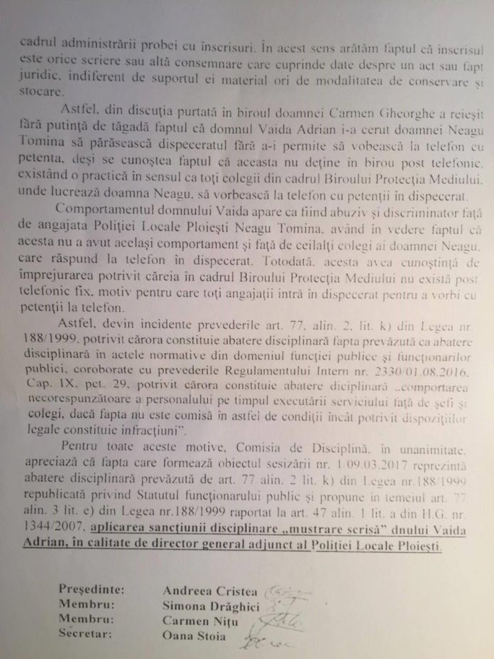 - Aceste inregistrari audio si stenograme precum si cele care vor urma demonstreaza fara echivoc ca introducerea celor doi politisti locali in comisia de disciplina este o razbunarea a hartuitorului Adrian Vaida care ar tinde sa si “ii omoare”!