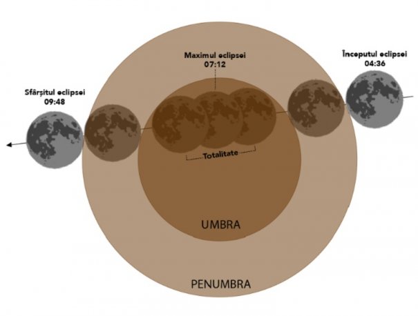 Faza de totalitate, când discul Lunii va fi mai întunecat decât de obicei, va începe la ora 06.41 şi va avea maximul la ora 07.12. Această fază se va încheia la ora 07.43.