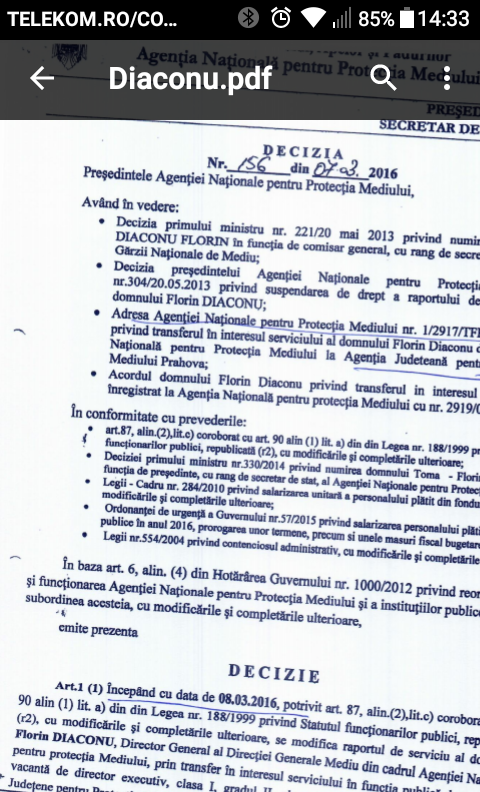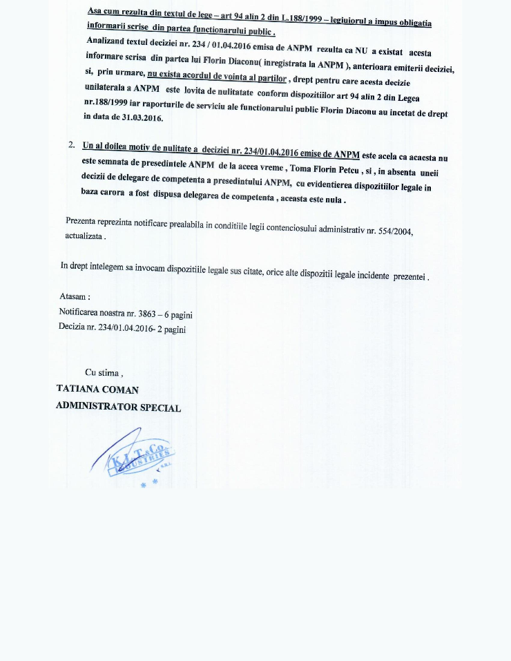 Astfel, desi art 94 alin 2 din L.188/1999  stipuleaza in mod explicit obligatia de informare in scris a persoanei care are competenta legala de numire cu privire la incetarea suspendarii in caz contrar inceteaza de drept raporturile de serviciu ale functionarului public …. Florin Diaconu este mai presus de lege. Fara a exista informare scrisa despre care vorbeam mai sus  acesta este repus in functie prin decizia nr. 234/01.04.2016 ANPM .
