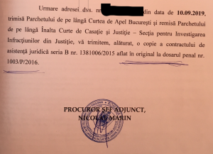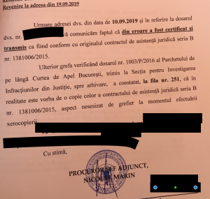 Achiesând la solicitarea avocatului și Inducând la rândul lui ,,în eroare” instanța de judecată, procurorul șef adjunct Nicolae Marin transmite către  instanța civilă, prin fals și uz de fals, în data de 19 septembrie 2019,  o legalizare a unei copii cu următorul text:  ,,originalul se află la dosarul penal 1003/P/2016” și  transmite copie după ,,originalul” aflat la acel dosar. Modul în care a fost confecționată ,,copia după original” este deasemenea grăitor. Dar iată adresa prin care procurorul șef Nicolae Marin, minte instanța civilă:
