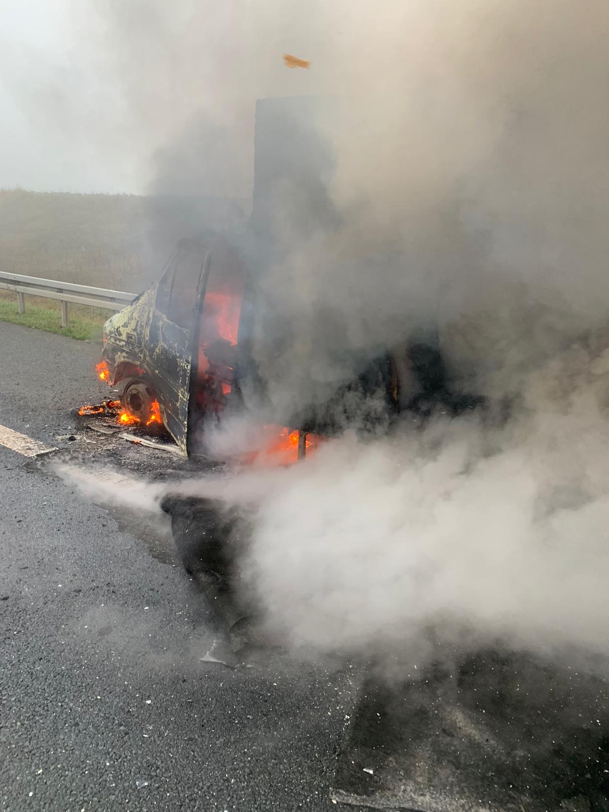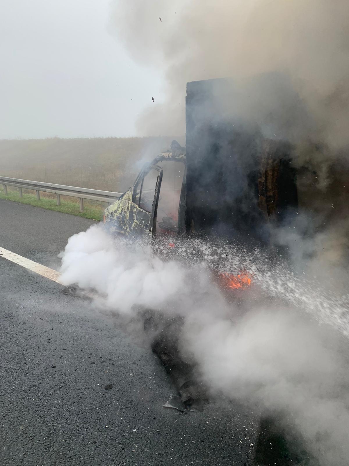O autoutilitară care circula în această dimineață pe autostrada A1, în apropierea localității Giarmata, a luat foc. Vehiculul a fost distrus de incendiu, dar nu au fost înregistrate victime.