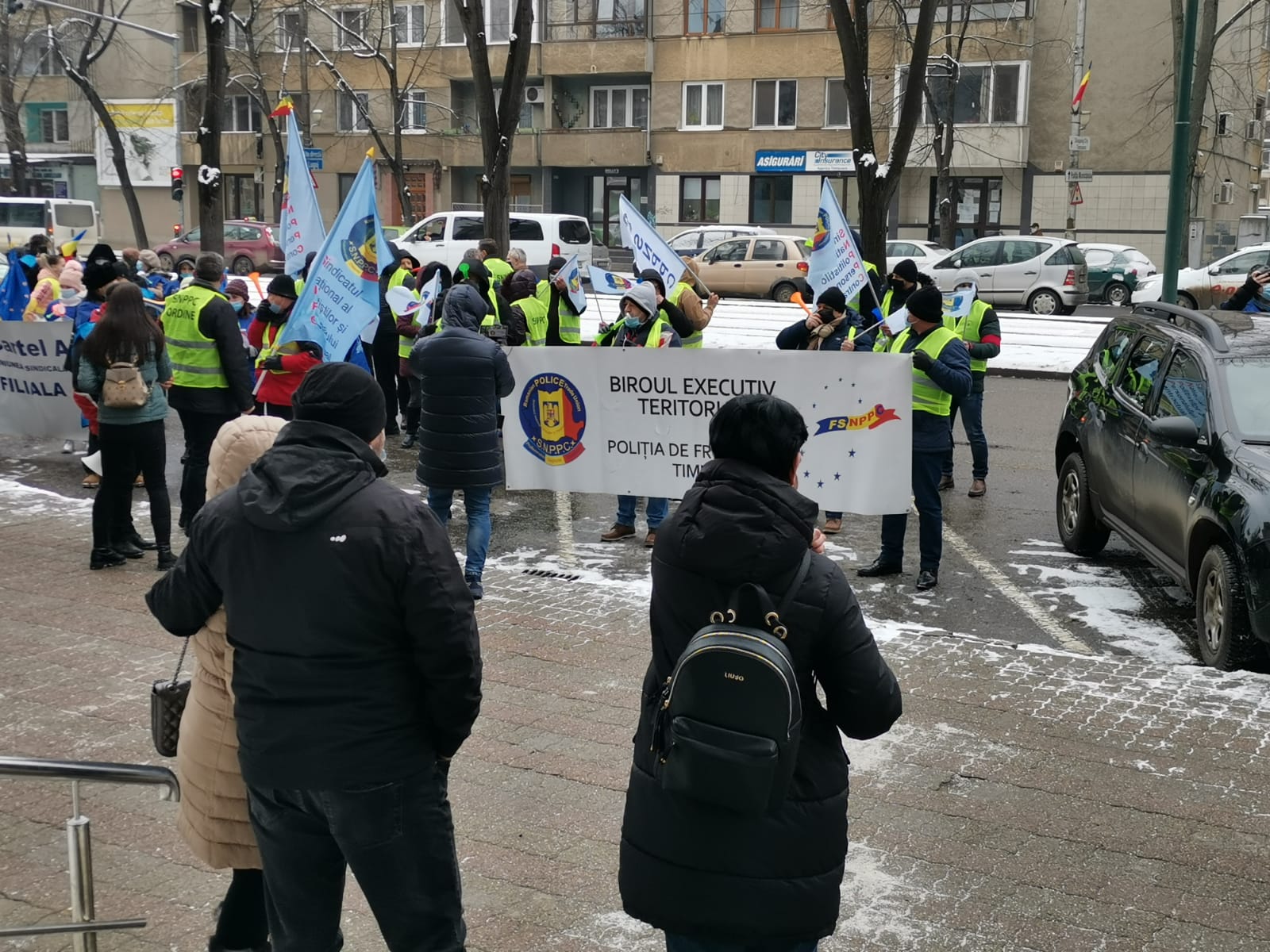 Clădirea Prefecturii Timiș a fost din nou pichetată de sindicaliști, după ce și săptămâna precedent, în mai multe zile, reprezentanții angajaților au protestat într-un mod similar. Luni a fost rândul celor de la Uniunea Sindicală Cartel Alfa Timiș să protesteze în fața Palatului Administrativ.