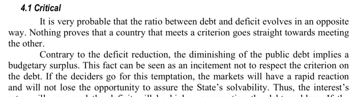 - Diminuarea datoriei publice (ca procent în PIB așa cum stipulează criteriul de convergență) nu implică surplus bugetar. Ponderea datoriei publice în PIB (Maastricht) poate scădea chiar cu deficit bugetar, atâta timp cât PIB-ul real crește, pentru că la pondere se referă criteriul și nu la valoare nominală. Desigur, Nicu Marcu nu oferă nicio dată, nu analizează niciun stat, nu face niciun calcul, nu evaluează nicio dinamică a datoriei publice în niciun stat în maculatura plătită din bani europeni și numită: ,,Impactul criteriilor de convergență asupra statelor din zona Euro”. Vă închipuiți că deși articolul anunță impactul asupr (tuturor) statelor din Zona Euro și al (tuturor) criteriilor de convergență asupra (tuturor) statelor din zona Euro, în articol nu se regăsește nici măcar menționat vreun stat din zona Euro, nici măcar impactul criteriilor asupra unui singur stat? Maculatură plătită din bani publici pentru concluzia ,,nu se știe”, respectiv pentru bunăstarea cercetătorului post-doctoral, Nicu Marcu.