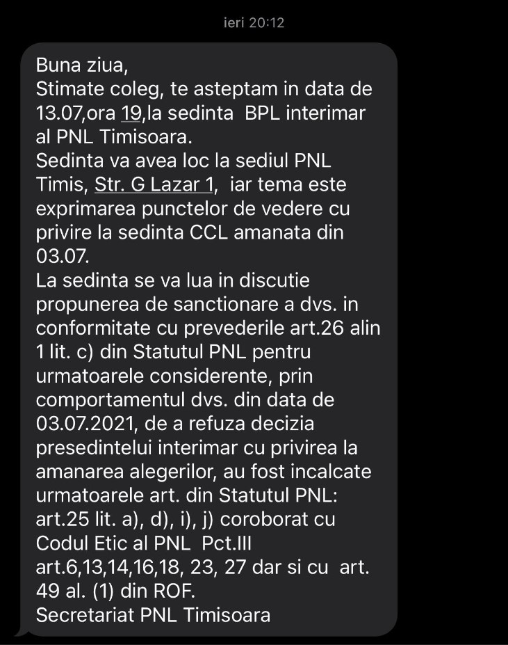 Ca dovadă a dorinței de sancționare, aceștia prezintă și un printscreen după un mesaj primit de unul dintre membri, un text destul de… sadic, în care respectivul membru este invitat politicos la ședință pentru a-și exprima punctul de vedere referitor la ”ședința CCL amânată”. După care, tot pe un ton politicos, i se mai transmite că ”La ședință se va lua în discuție propunerea de sancționare a dvs. în conformitate cu prevederile art.26 alin1 lit. c) din Statutul PNL pentru urmatoarele considerente, prin comportamentu dvs. Din data de 03.07.2021, de a refuza decizia președintelui interimar cu privire la amânarea alegerilor”.