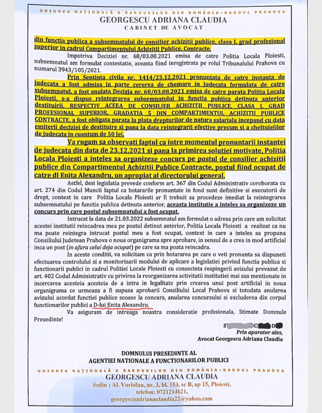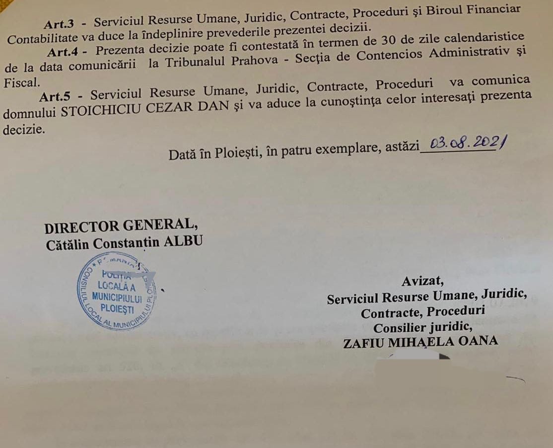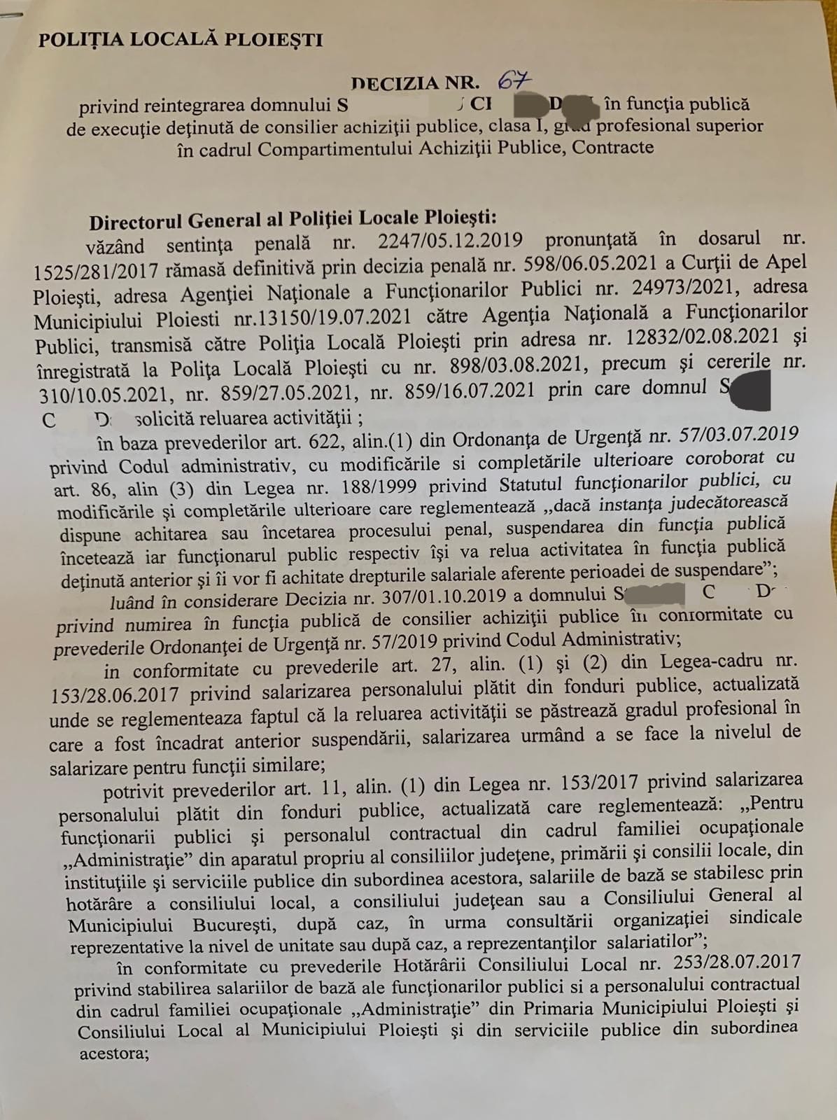La data de 21.03.2022, Politia Locala Ploiesti a primit motivarea deciziei redactata la 15 martie, decizia aceea executorie din 2021 prin care S.C.D trebuia reaincadrat.
