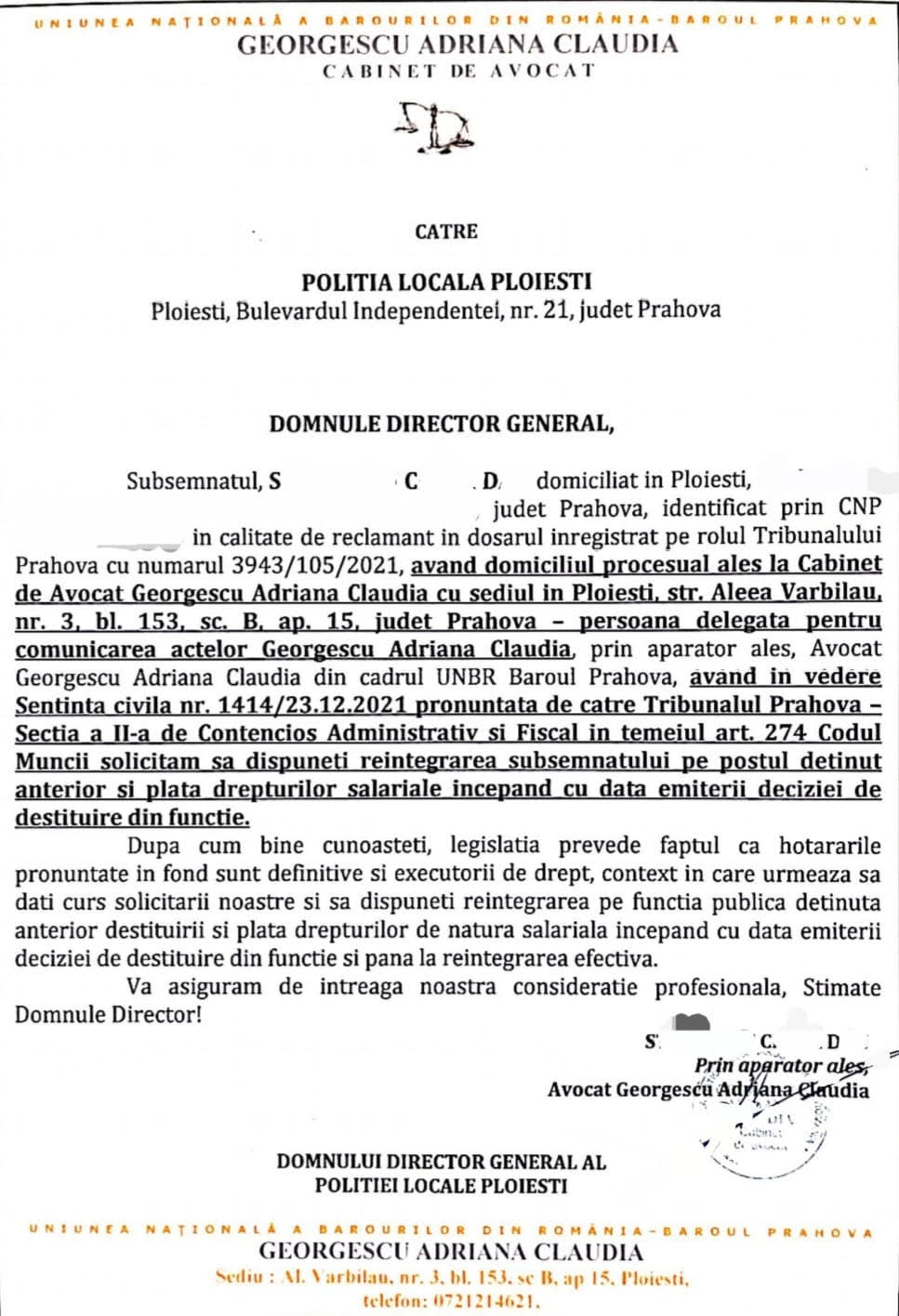 In data de 21.03.2022, S.C.D a transmis Politiei Locale Ploiesti adresa de reaincadrare conform hotararii instantei care este executorie.