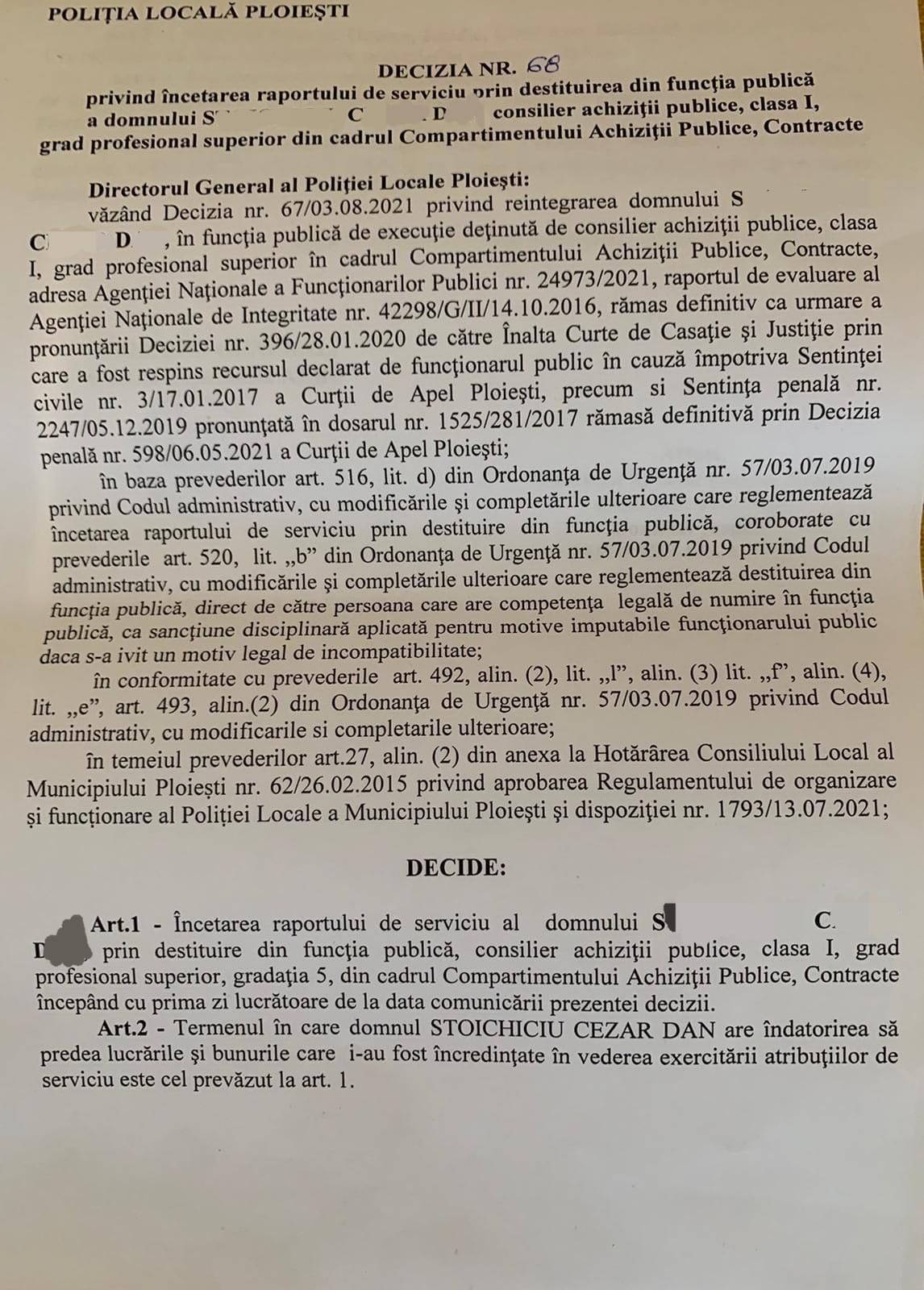 Pentru a demonstra ca acest prejudiciu adus bugetului local NU este de ajuns (aceste sume fiind platite din taxele ploiestenilor), onor Albu Catalin, in bataie de joc fata de lege si de banii ploiestenilor, emite in acelasi minut din data de 03.08.2021, o noua decizie (nr 68) printr-o interpretare propie a legii si il destituie, ilegal, pe acelasi S.C.D pe care instanta il obligase sa il reaincadreze.