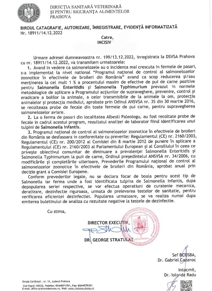 Conform prevederilor legale, nu se DECLARA focar de boala pentru acest tip de Salmonella iar ferma unde a fost identificata tulpina de Salmonella Infantis, dupa depopularea seriei respective, se vor efectua operatiuni de curatenie mecanica, deratizare, dezinfectie riguroasa, urmata de prelevarea testelor de sanitatie, pentru verificarea eficientei dezinfectiei. Popularea urmatoare, se va realiza numai dupa emiterea buletinului de analiza cu rezultate negative la testele de dezinfectie”.