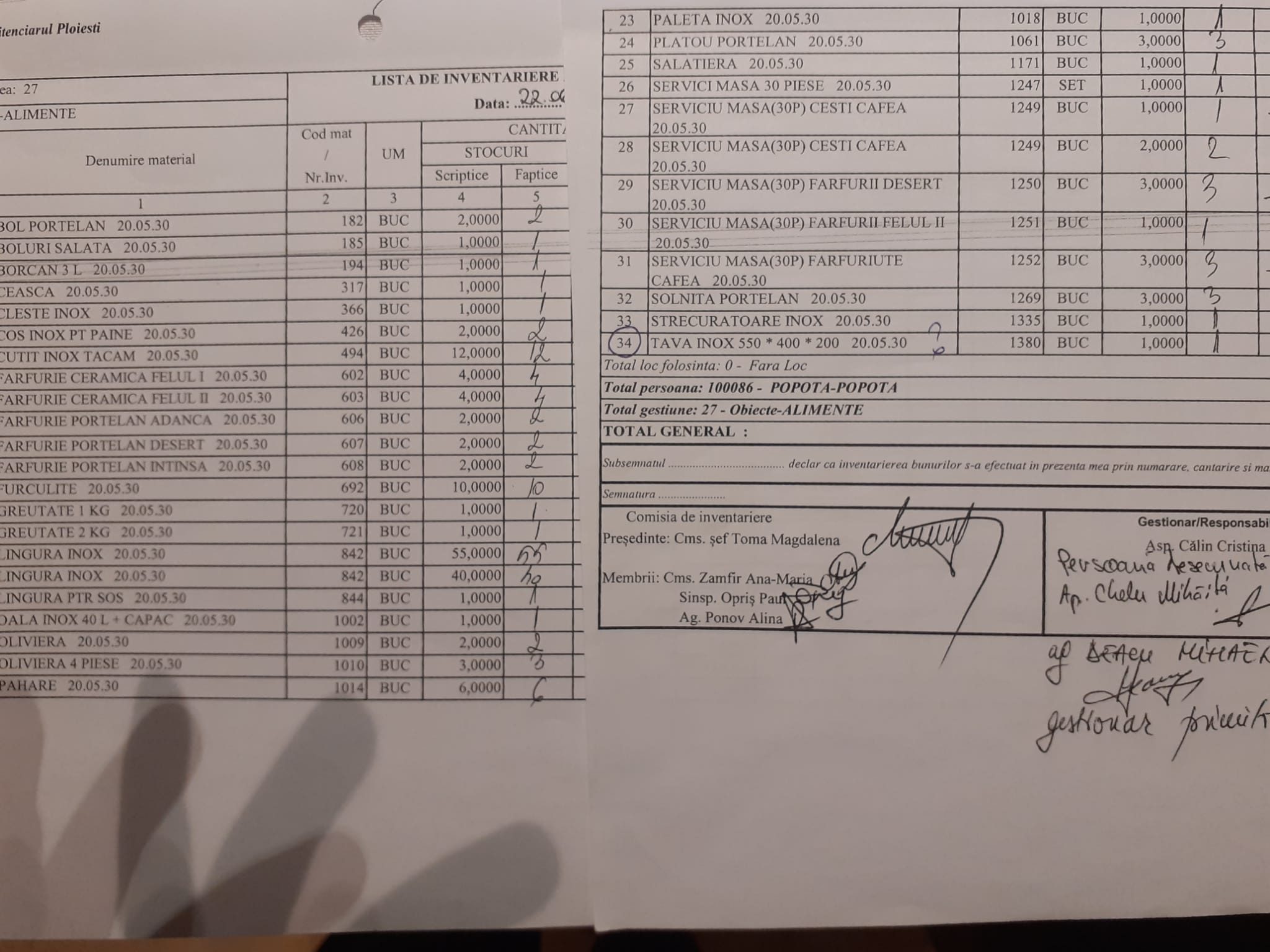 Dacă Deacu Mihaela confirmă prin Notă despre faptul că întreaga gestiune POPOTĂ este formată din bunuri cu grad ridicat de uzură, ce nu mai pot fi folosite în activitatea popotei. De unde ai Magdaleno! plusuri la inventar?