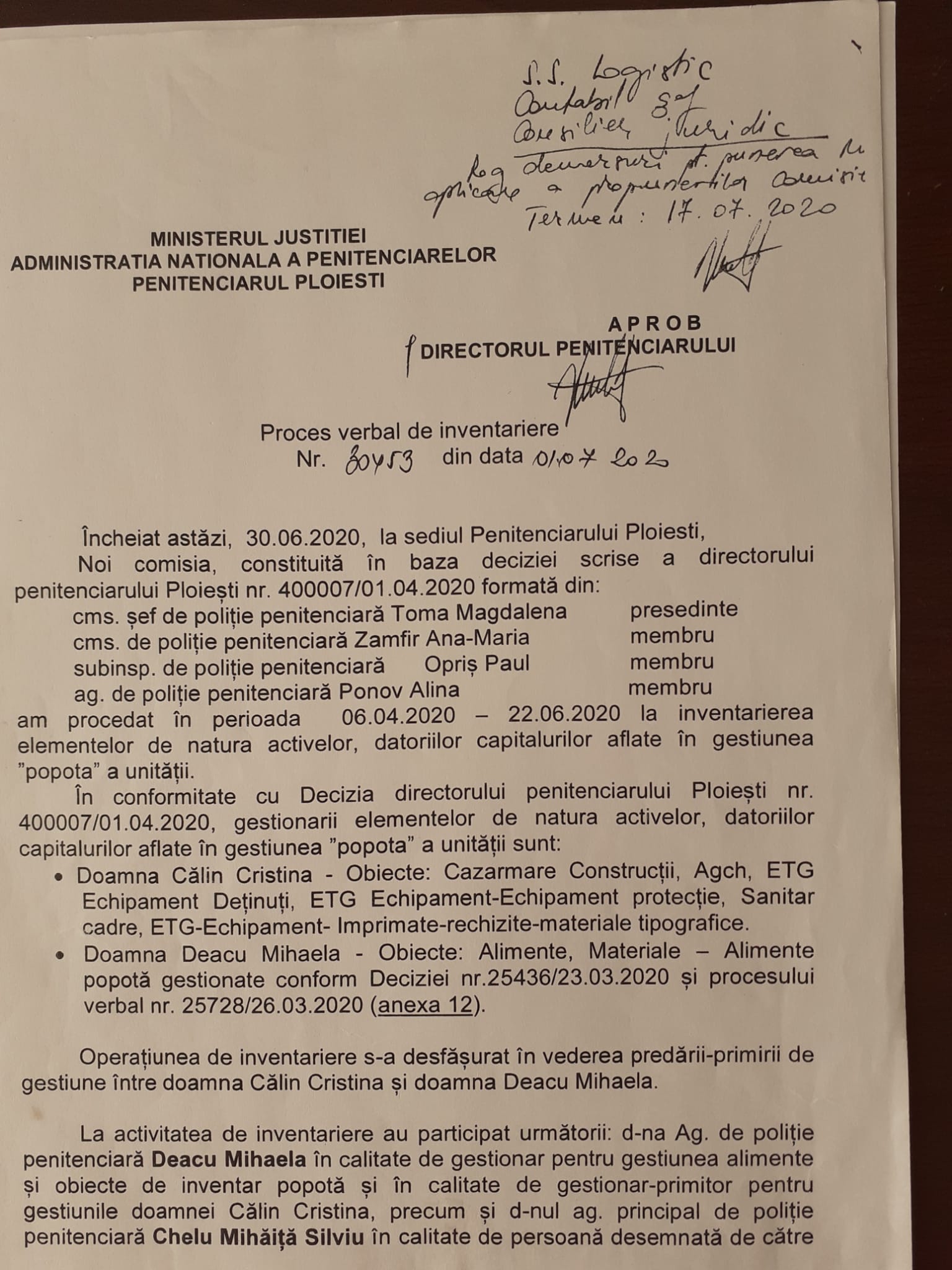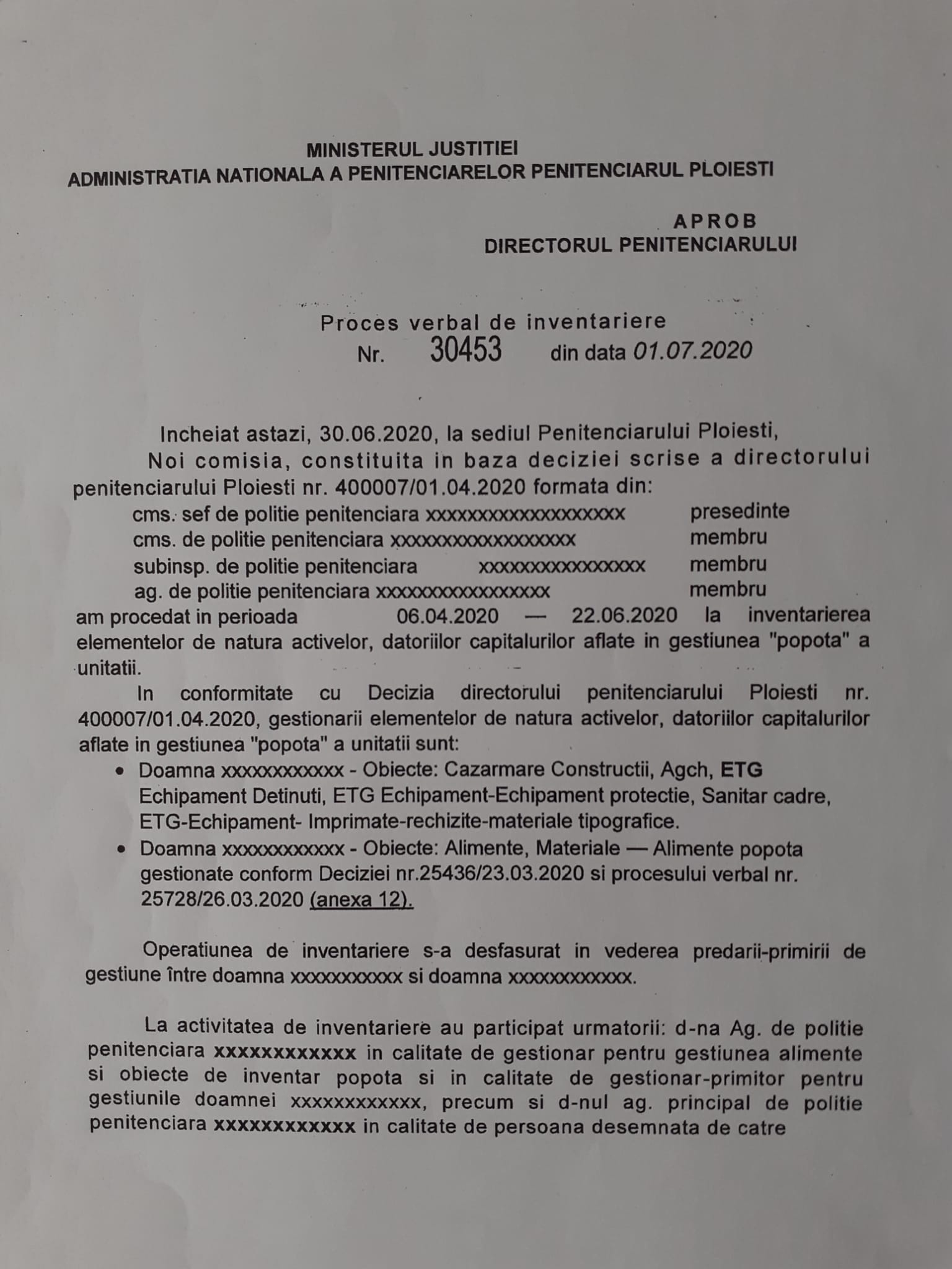 Priviți ce document PV verbal de inventariere i-a trimis Zeus , de pe adresa oficială de email a Penitenciarului Ploiești abia în data de 30.09.2020. În bătaie de joc! De nu se înțelege nimic! Fără liste de invenariere din care să rezulte lipsa imputată.