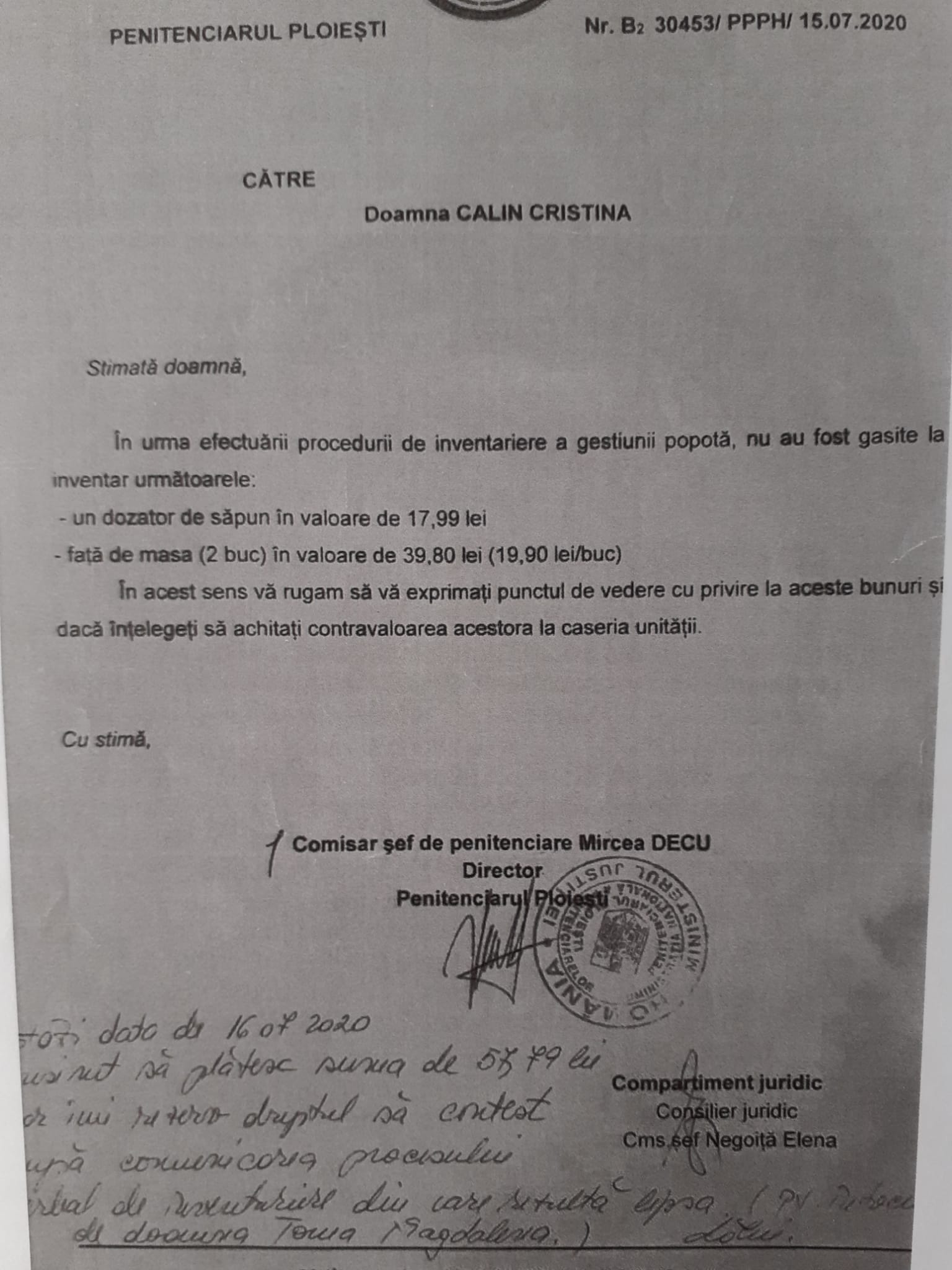 Este înregistrată în Contabilitatea Penitenciarului Ploiești. Totul în regulă.